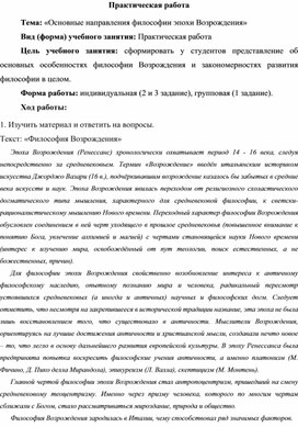 Обложка для материала Практическая работа «Основные направления философии эпохи Возрождения»