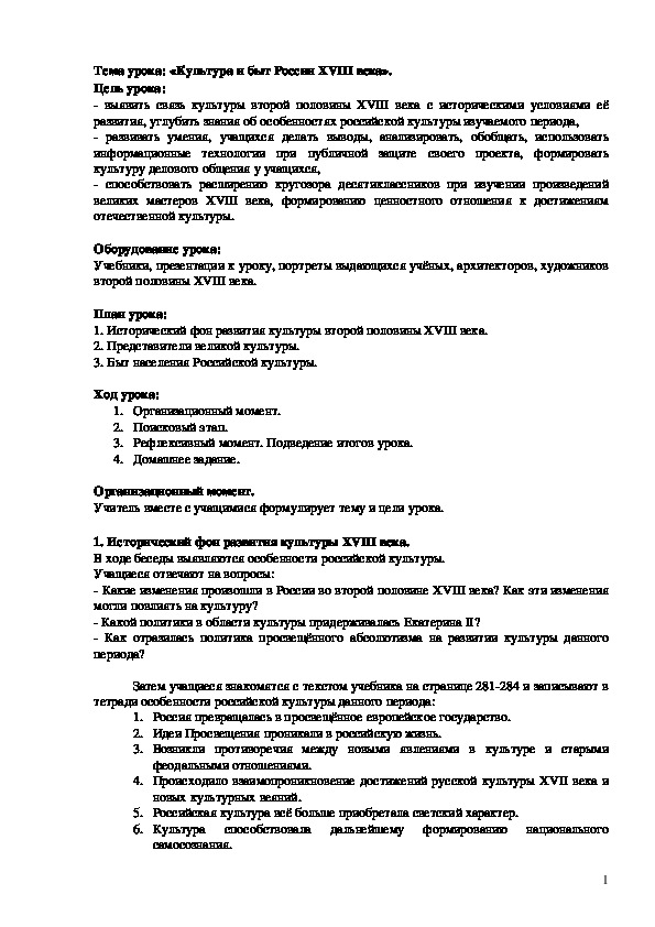 План урока по курсу истории России «Культура и быт России XVIII века» (проф.-техническое образование)